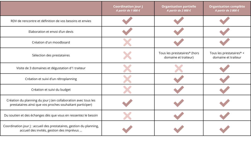 *Domaine, traiteur, photographe, vidéaste, make up artist, coiffeur, fleuriste, DJ, location matériel